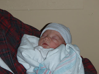 I'm finally here and able to hold this absolutely wonderful bundle of joy! He is perfect in every way. Ann and I are both trying to get our "fill" this afternoon, our first w/Dylan. Dark hair and a wonderful disposition. He's stretching and frailing his way through sleep. Funny thing, he doesn't even flinch when Brady (the dog) barks so we figure he's used to him from the "womb" and finds it no big deal. Love, love, love him already!